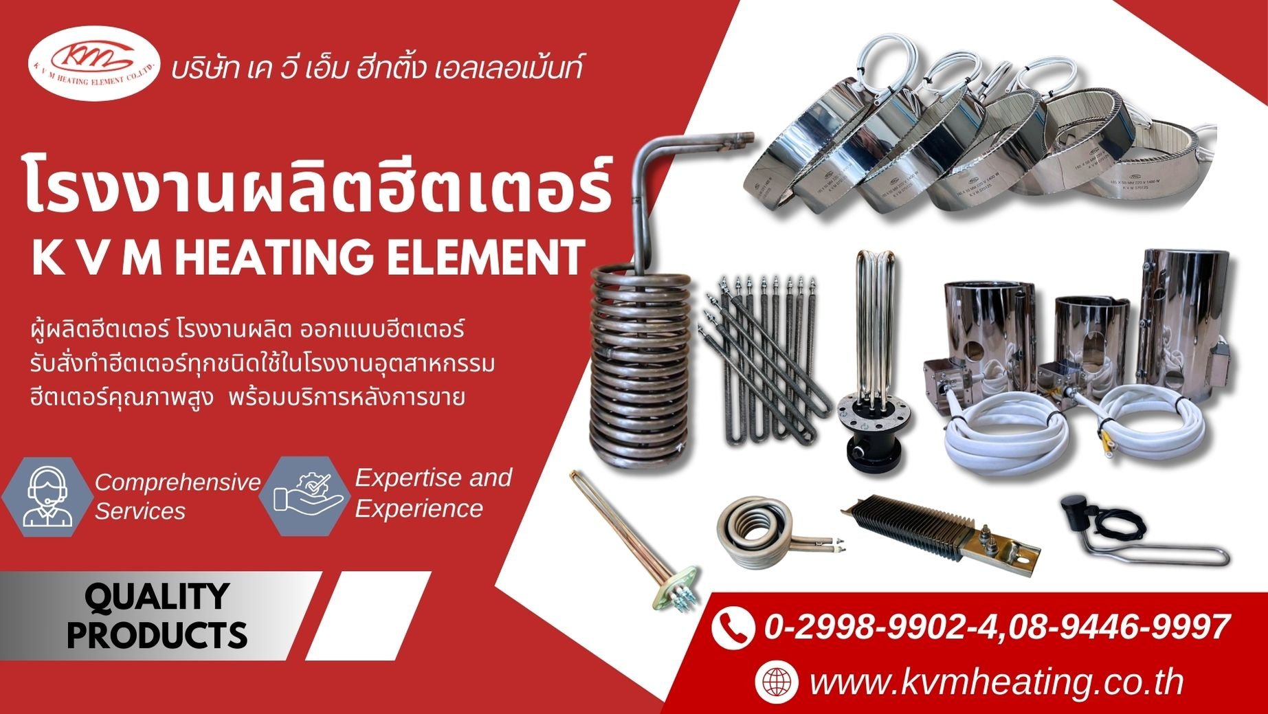 เควีเอ็มฮีทติ้ง เอลเลอเม้นท์ ประสบการณ์กว่า 23 ปี เรามีทั้งประสบการณ์และเจ้าหน้าที่ที่ชำนาญเฉพาะในการผลิตฮีตเตอร์ ฮีตเตอร์ทุกชิ้นผ่านตรวจสอบคุณภาพของ ก่อนจัดส่งเพื่อให้ลูกค้าได้ฮีทเตอร์ที่มีคุณภาพ พร้อมใช้งานได้อย่างมีประสิทธิภาพ มีบริการหลังการขาย ซ่อมแซม บำรุงรักษาตลอดอายุการใช้งาน มีบริการจัดส่งทั่วประเทศ