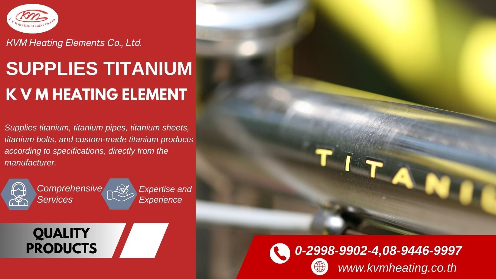 KVM Heating Element is a leading supplier and manufacturer of titanium pipes, titanium bolts, titanium sheets, and custom-made titanium products. With expertise and experience in the industry, we are dedicated to offering the highest quality products suitable for a wide range of applications, from industrial machinery, research, and advanced technologies to medical uses.